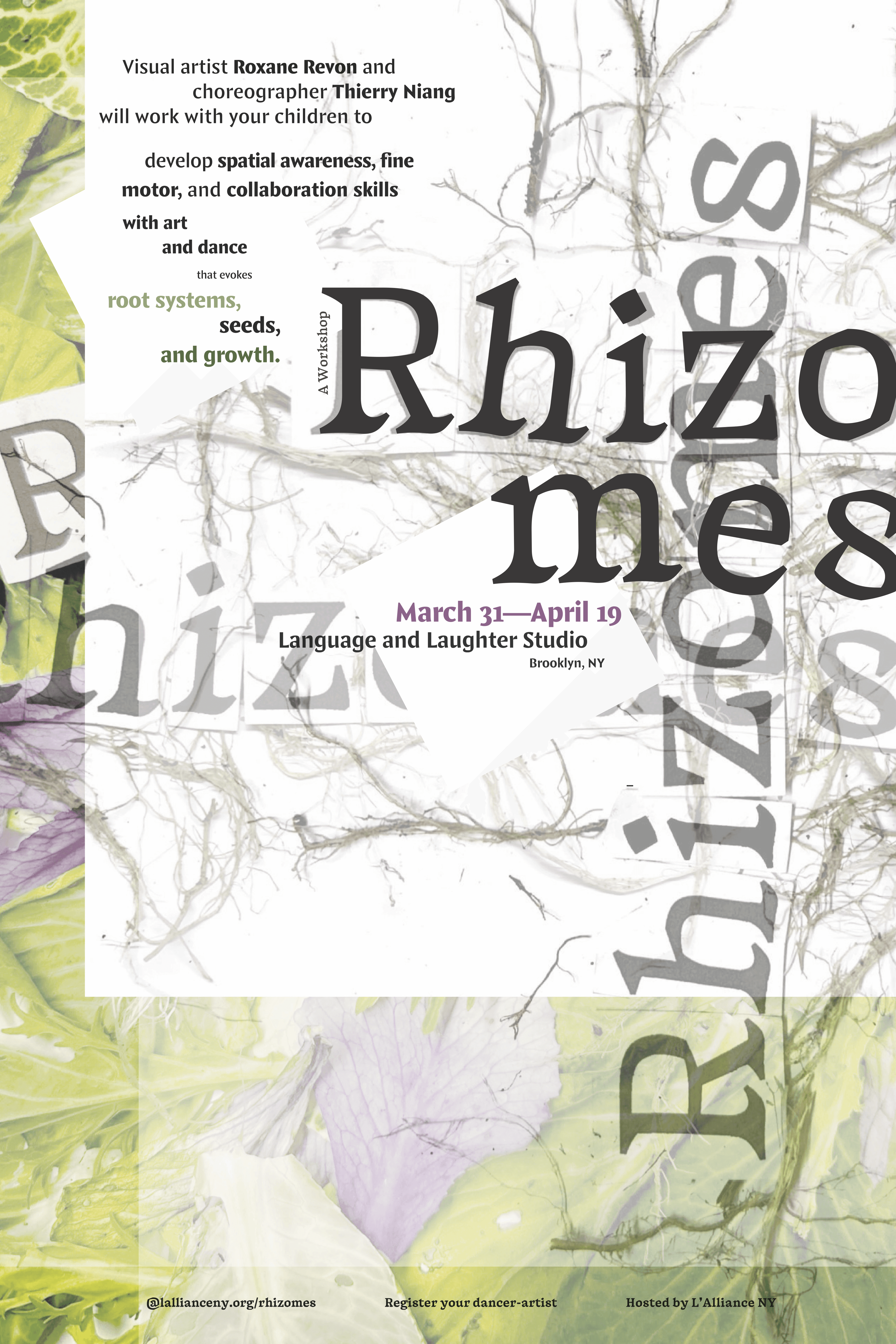 A poster for the event “Rhizomes,” a two week dance workshop for preschoolers at the French Cultural Center, L'Alliance NYC.