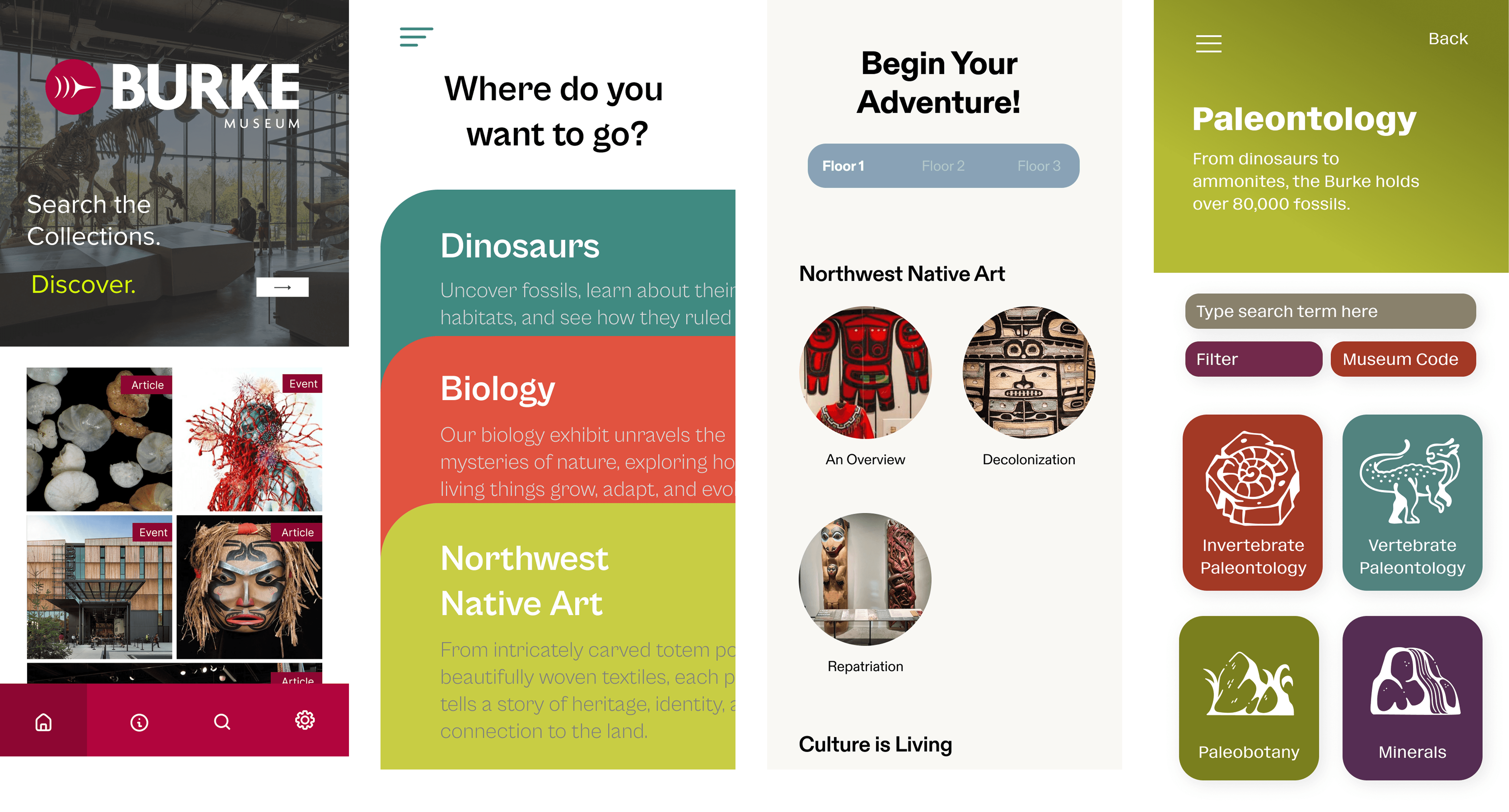We chose to construct the information architecture of the application to mirror the physical architecture and experience of being in the Burke. We organized the home page by the floors of the museum so that guests could explore the exhibits exactly how they'd experience them in-person. From there, we added centralized locations in the app to view the Burke's events and news, as well as the ability to scan artifacts within the museum to learn more about the Burke's collections.