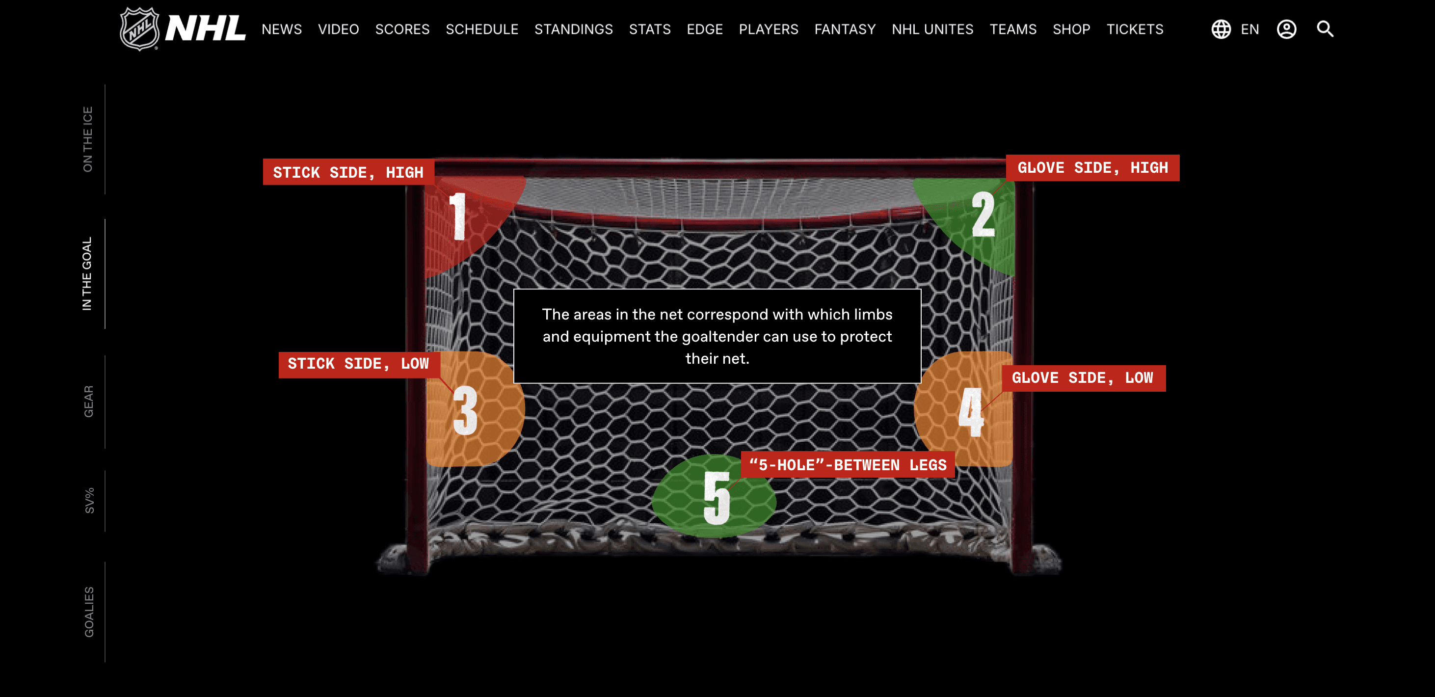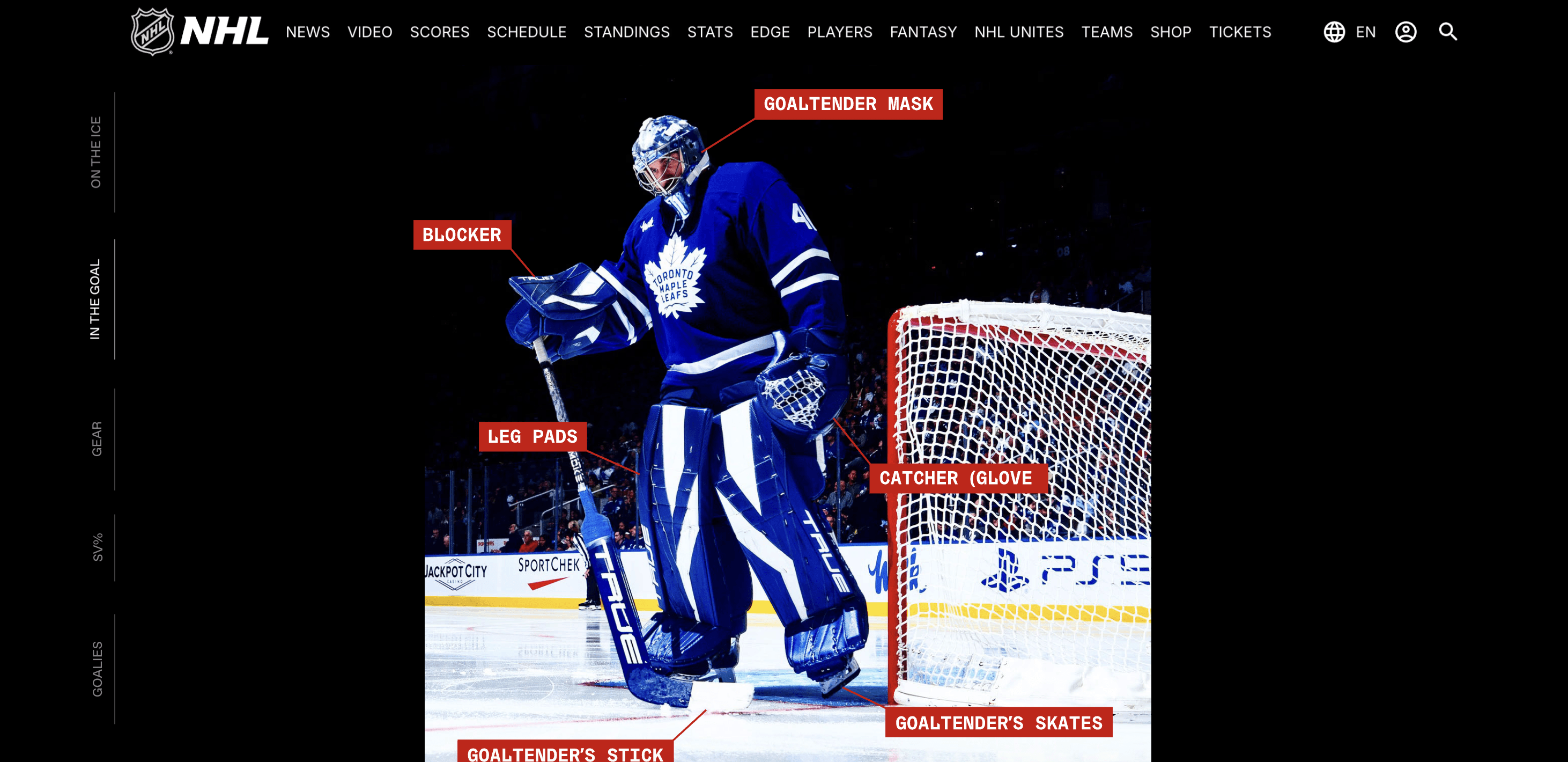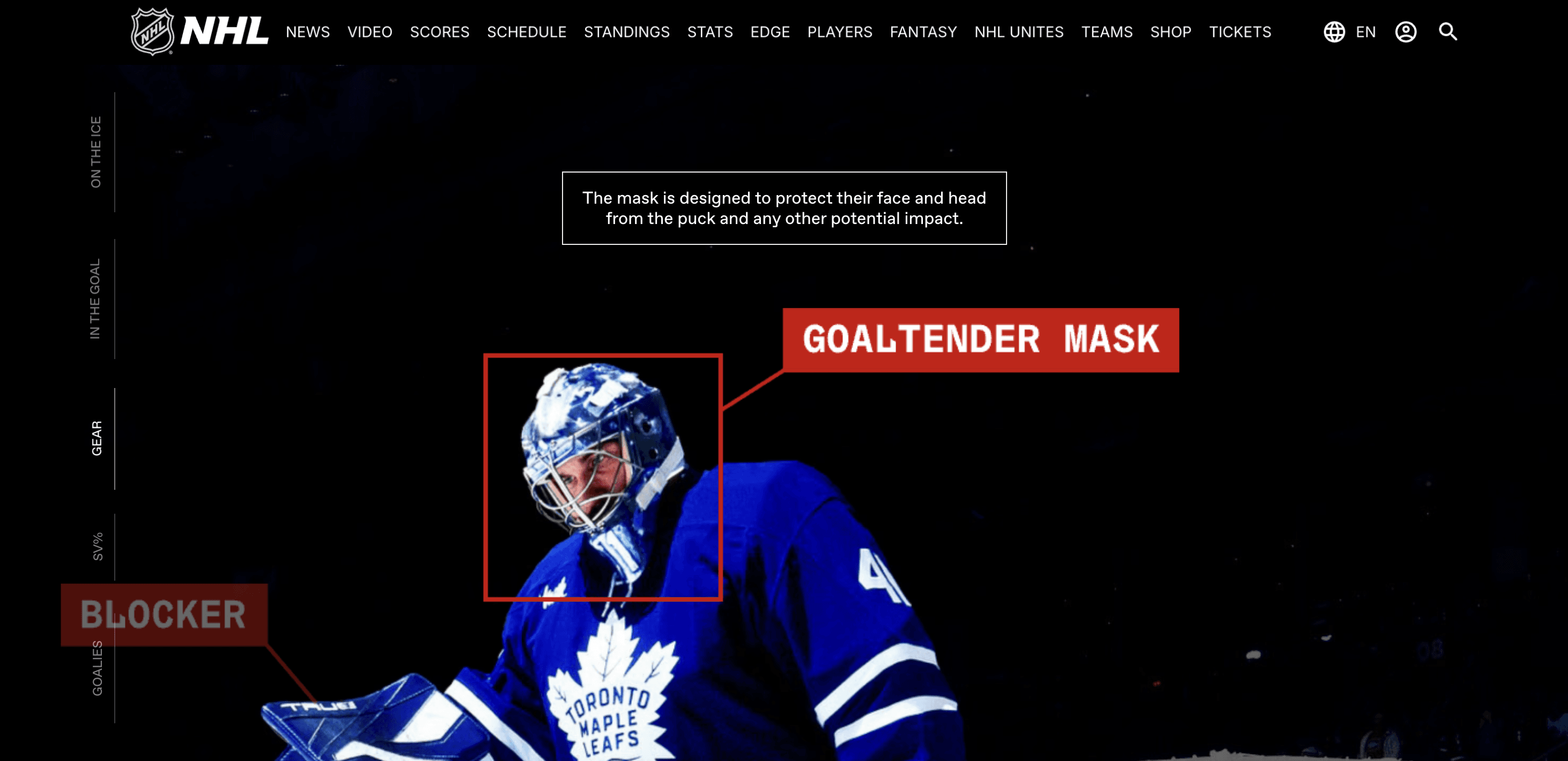 Framed within the National Hockey League's website, this website is designed as a part of a theoretical series of articles that explains the nuances of each hockey position to interested individuals. This specific article breaks down the roles, equipment, statistics, and rewards associated with goaltending in particular. Click here to scroll through the website.