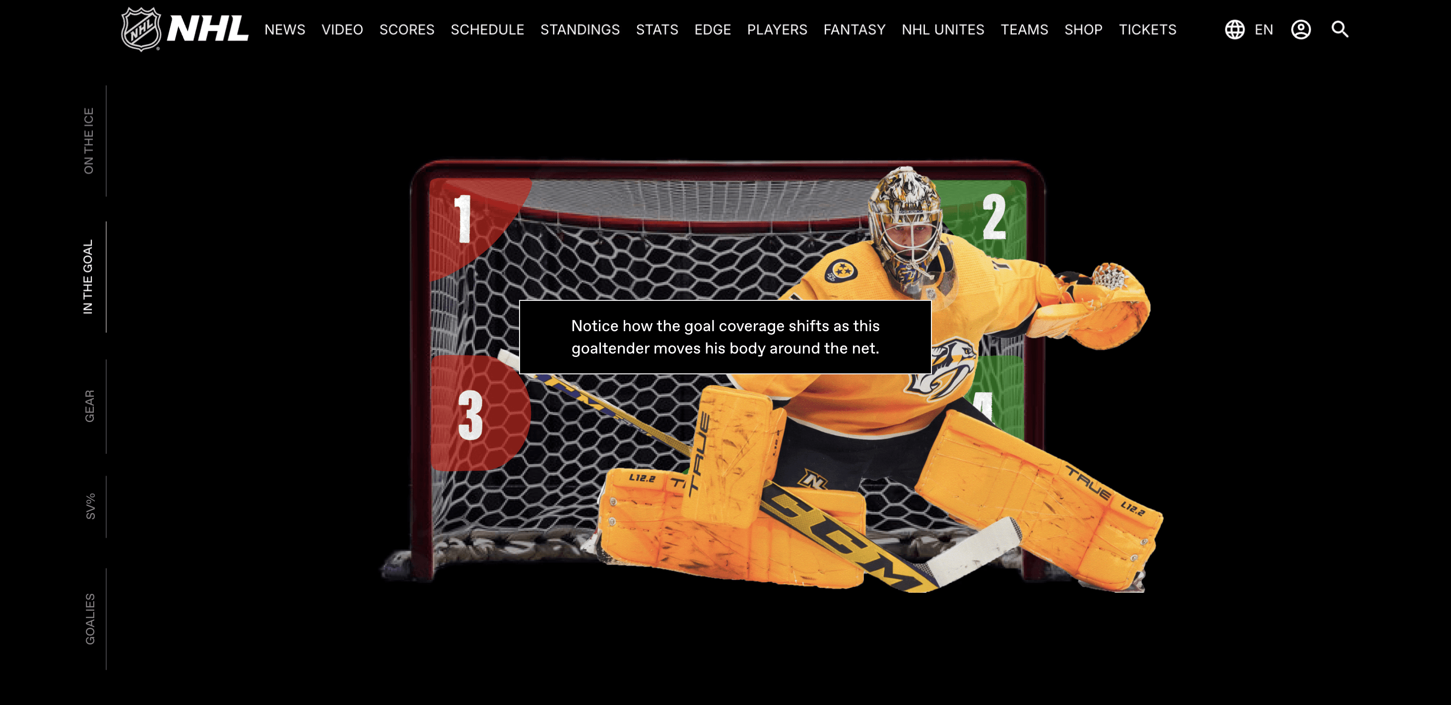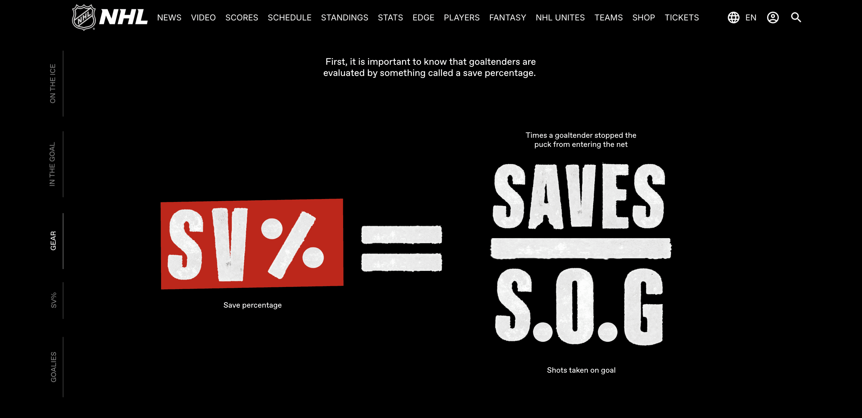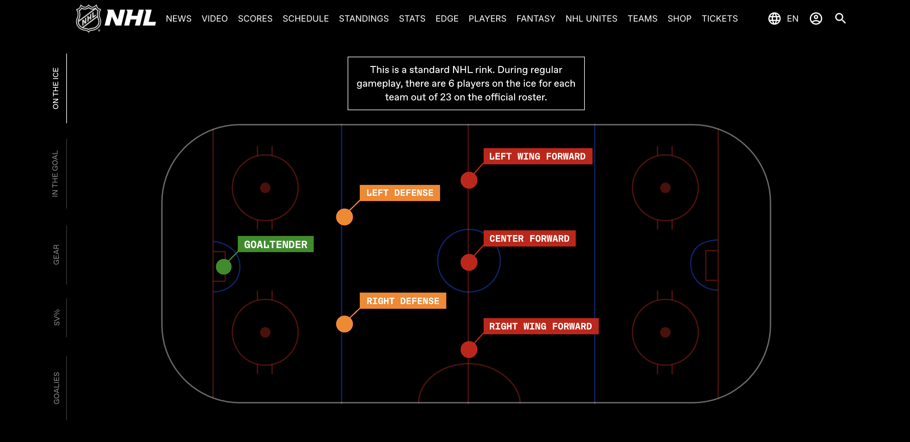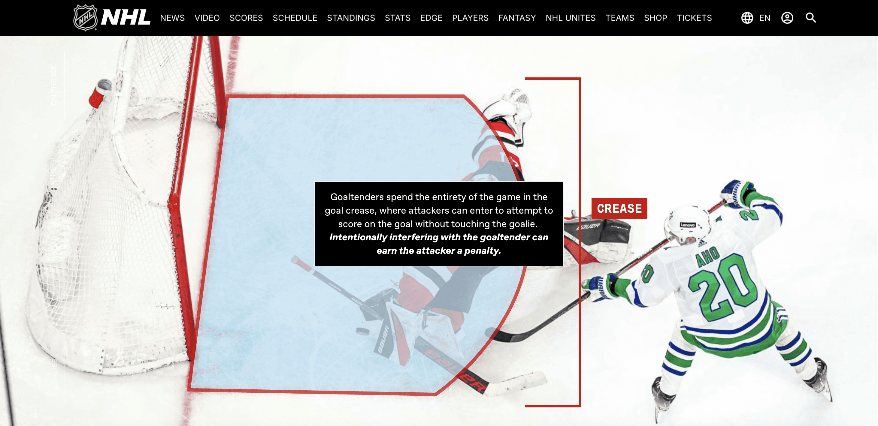 Framed within the National Hockey League's website, this website is designed as a part of a theoretical series of articles that explains the nuances of each hockey position to interested individuals. This specific article breaks down the roles, equipment, statistics, and rewards associated with goaltending in particular. Click here to scroll through the website.