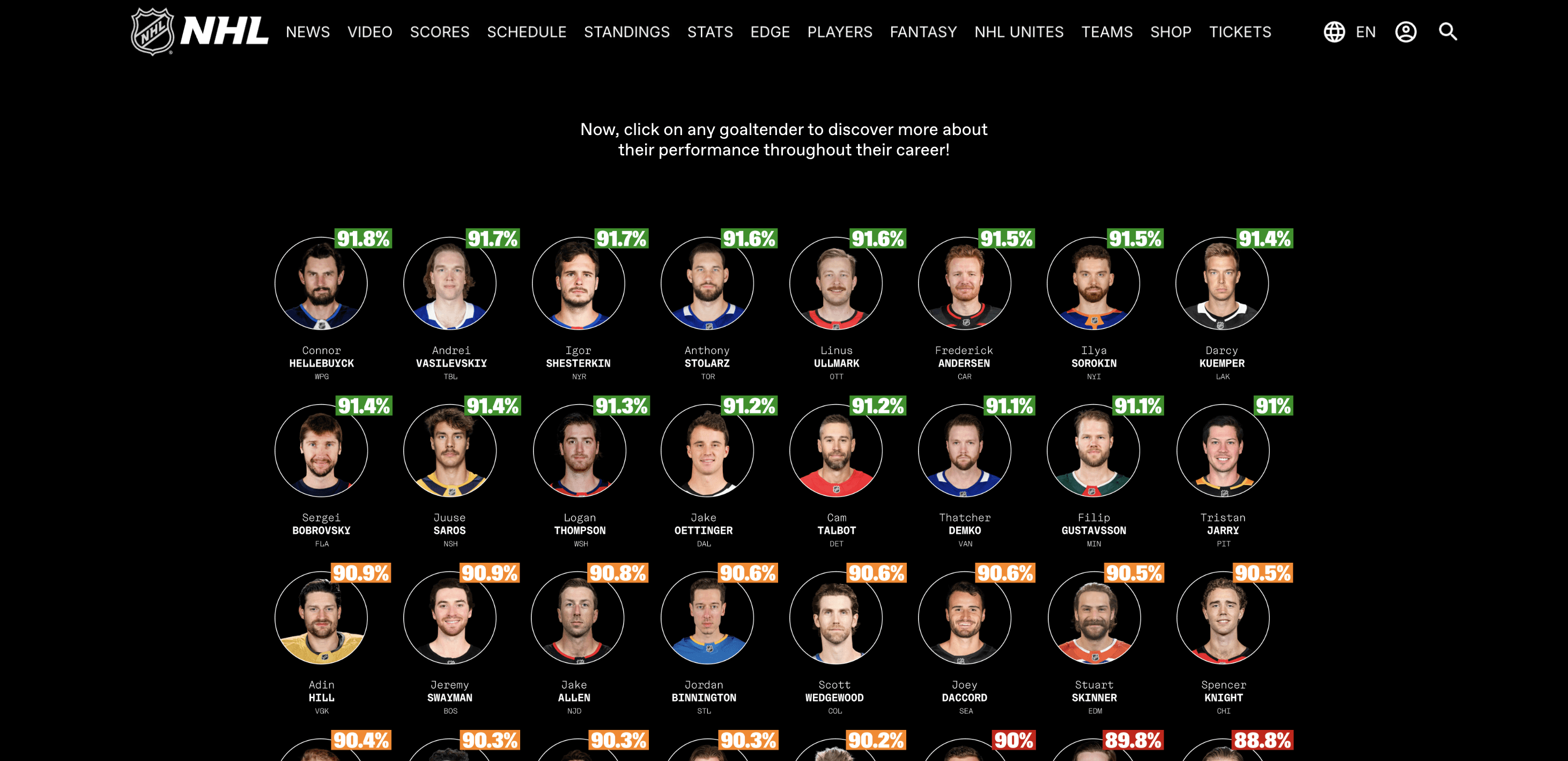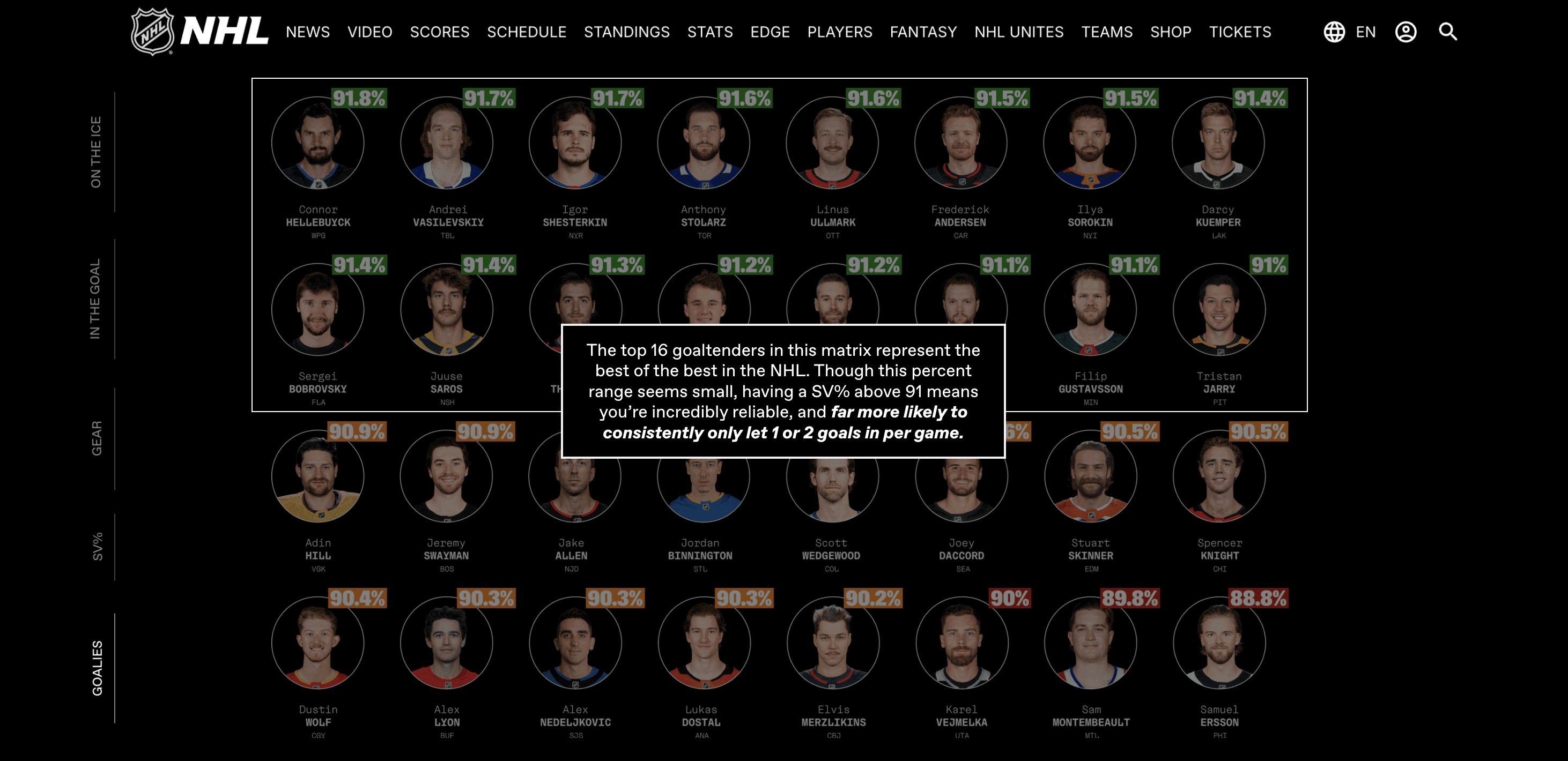 Early in the development phase of my project, I decided I wanted to show the statistics of a few goalies to explain the range of skills and differences in tasks in the NHL.