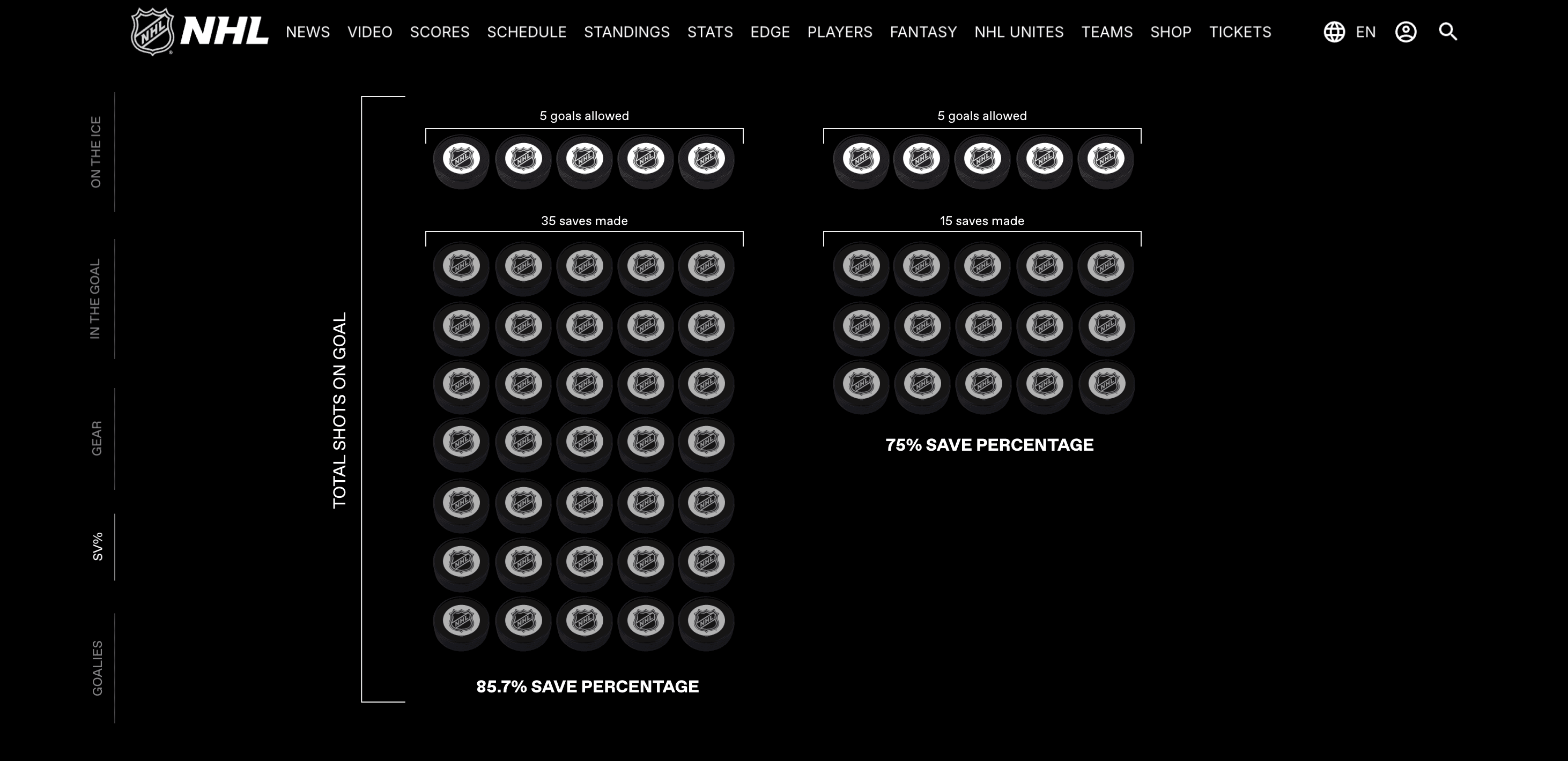 Here, I used pucks to show the way that the shots on goal effect a save percentage and help readers conceptualize what each shot represents.