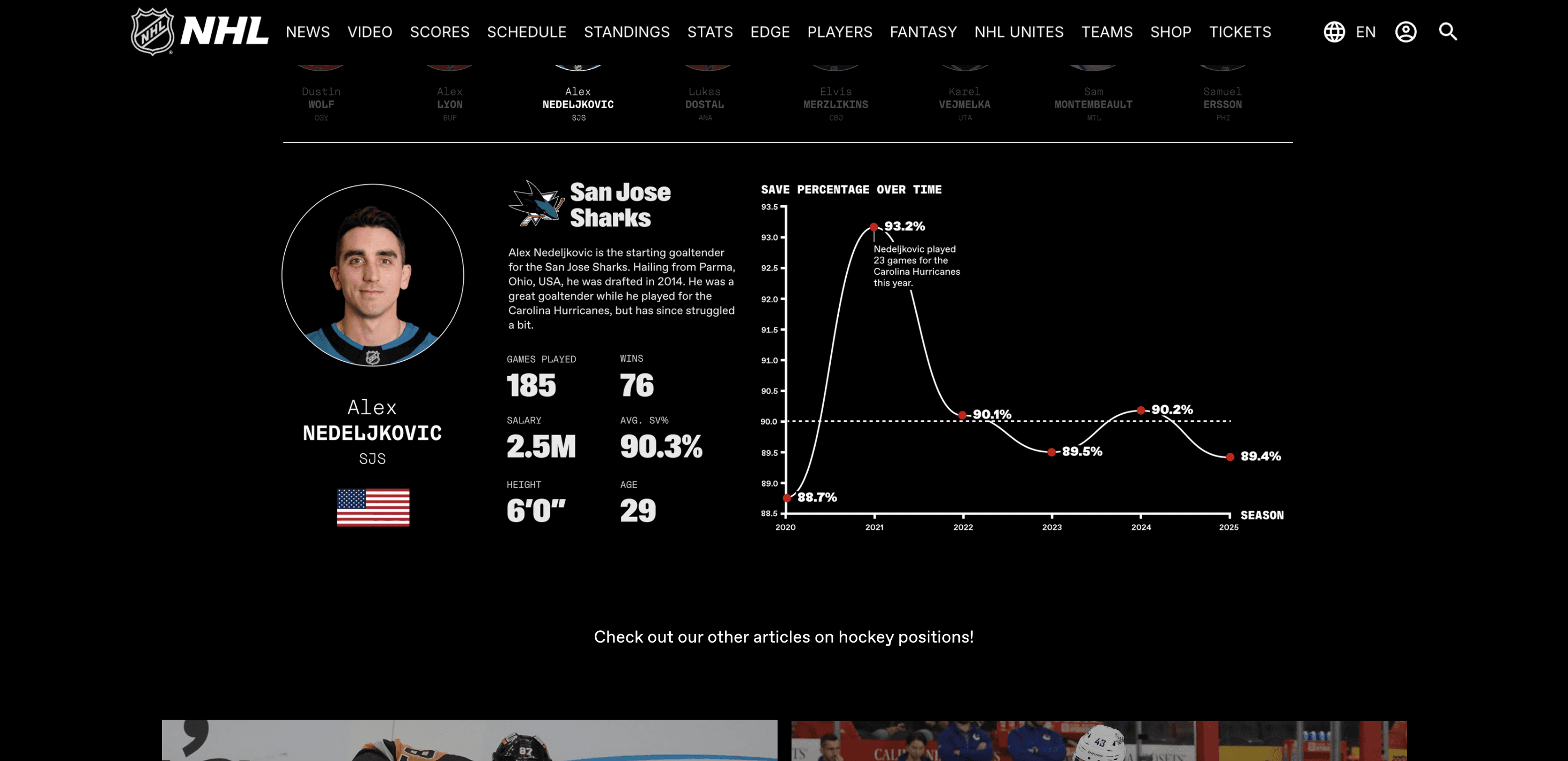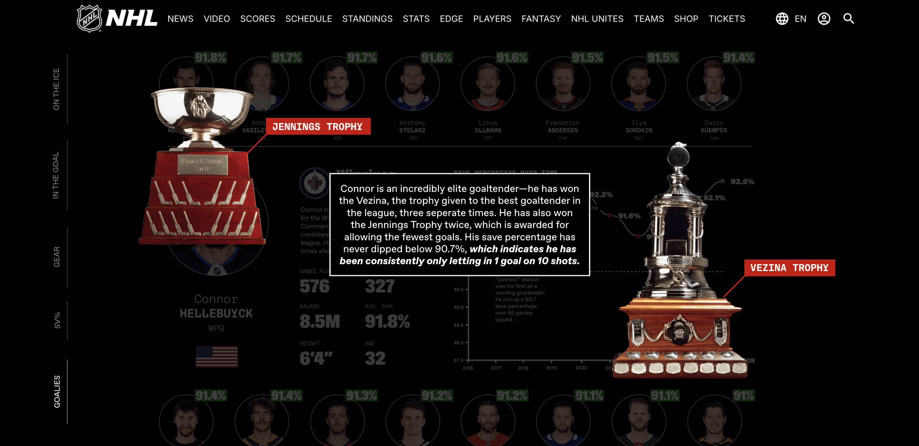 Every goaltender who was described in this section was shown alongside a graph of their career save percentages and information about their careers and statistics.