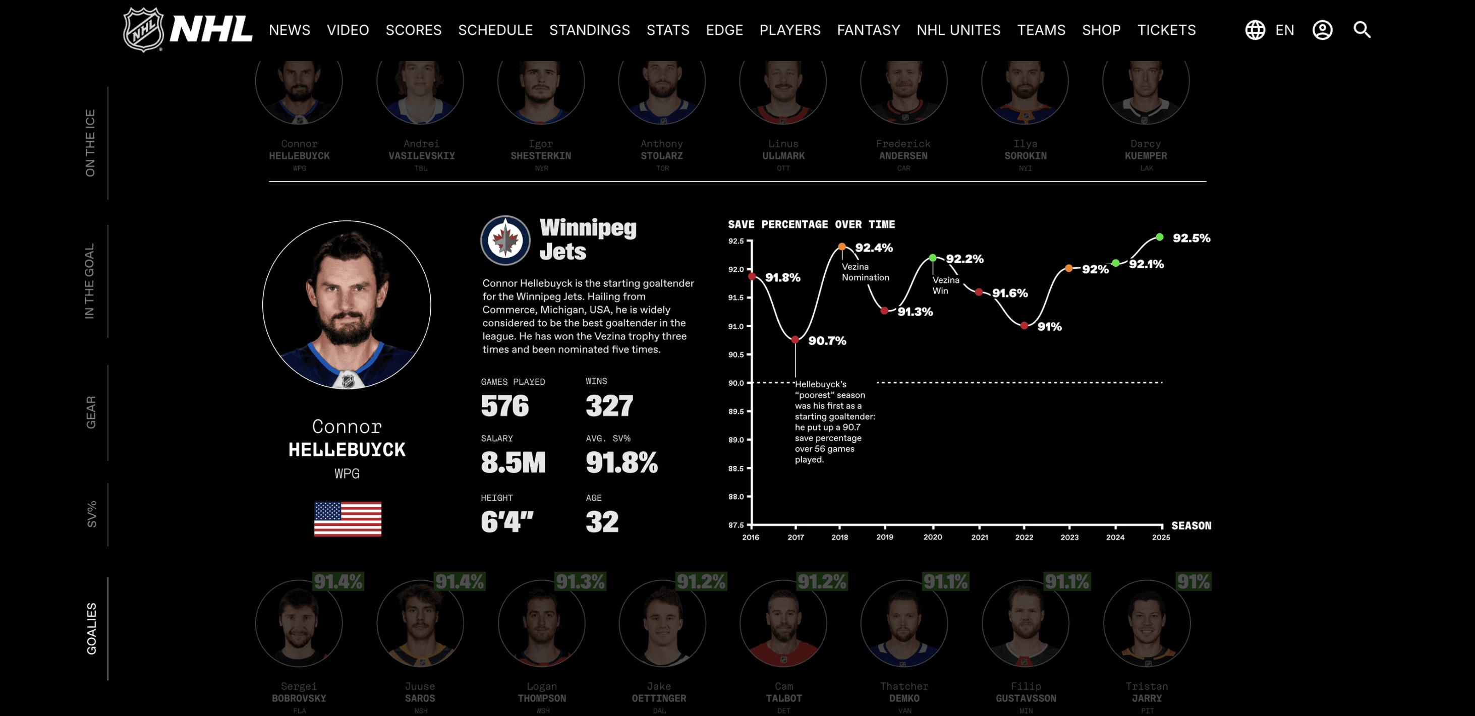 Since Connor Hellebuyck is statistically the best goaltender in this matrix, I did a deeper dive on his career and awards he has received.